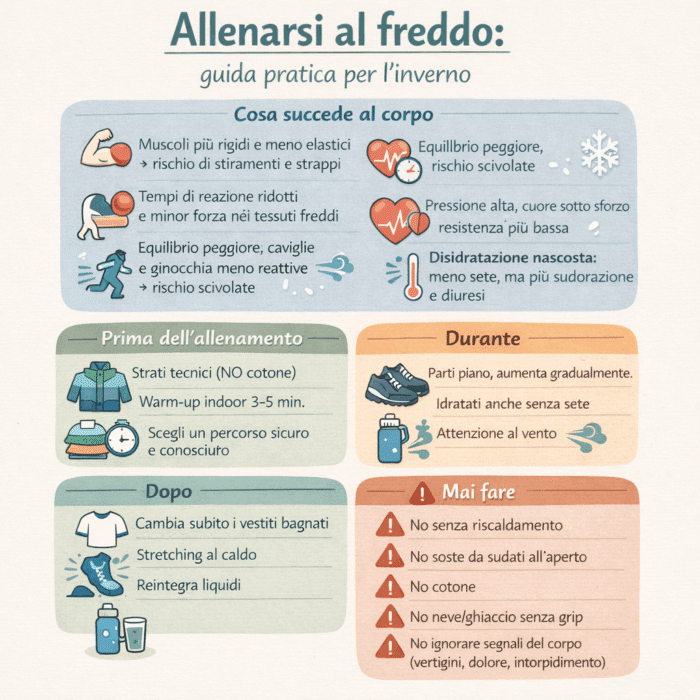 | Corsa | Rigidità muscolare, scivolate, affaticamento cardiaco | Riscaldamento lungo, scarpe con grip, partire piano | Partire veloce, correre su ghiaccio |