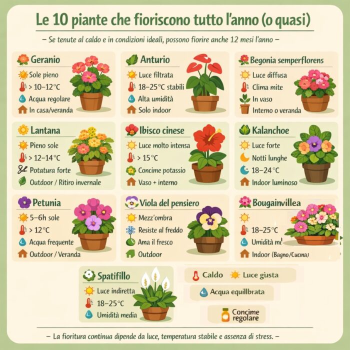 Avere fiori tutto l’anno non è un sogno irrealizzabile né un privilegio da giardinieri esperti. Esistono piante straordinariamente generose che, se curate nel modo giusto, fioriscono senza sosta per mesi o addirittura per tutto l’anno, anche su balconi cittadini o in casa. In questa guida scoprirai le 10 piante più affidabili, perché fioriscono così a lungo e soprattutto come mantenerle sempre sane e produttive, evitando gli errori più comuni.