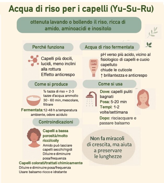Un piccolo studio tecnico citato spesso (Fonte: The effect of rinse water obtained from the washing of rice (YU-SU-RU) as a hair treatment, International Journal of Cosmetic Science, 2010) ha rilevato che l’acqua di riso può ridurre l’attrito superficiale e aumentare l’elasticità del fusto, effetti attribuiti soprattutto all’inositolo, zucchero che penetra e resta nel capello anche dopo il risciacquo.