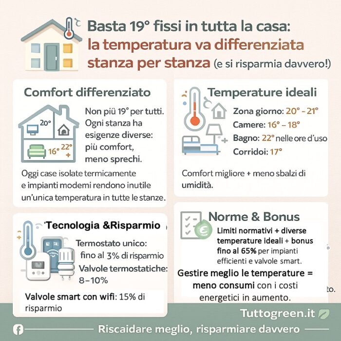 • Corridoi e ingressi: sui 17°. Sono aree di passaggio che non richiedono lo stesso setpoint delle stanze principali.