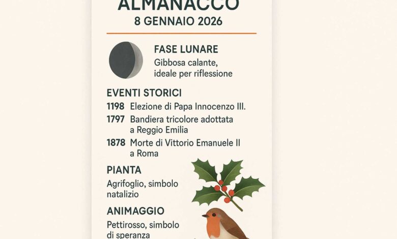 Benvenuti all’almanacco quotidiano, dove il soffio gelido dell’inverno ci accompagna in questo 8 gennaio 2026. L’inverno avvolge il paesaggio in un abbraccio silenzioso, mentre ci prepariamo a scoprire le meraviglie di questa giornata.