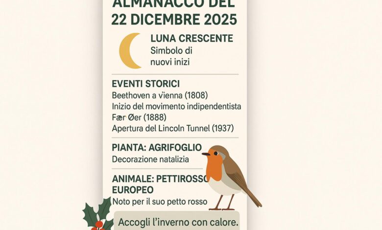 Benvenuti all’almanacco di oggi, 22 dicembre 2025. In questa fredda giornata d’inverno, mentre ci avviciniamo alle festività, la natura si presenta nella sua austerità e bellezza. Gli alberi spogli e il cielo limpido ci ricordano la quiete e il riposo della stagione.