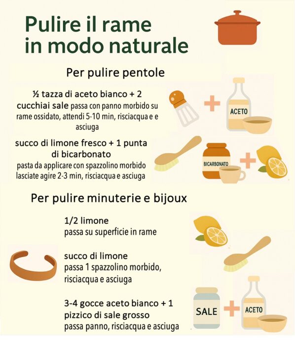 Pulire il rame in modo naturale non significa rinunciare all’efficacia. Con ingredienti che probabilmente avete già in dispensa, come limone, aceto, sale, bicarbonato, potete restituire splendore a pentole, bracciali o decorazioni in rame evitandone i danni più comuni. Seguite le ricette, i trucchi della nonna e il consiglio di manutenzione: il tuo rame sarà più bello, più sano e più ecologico