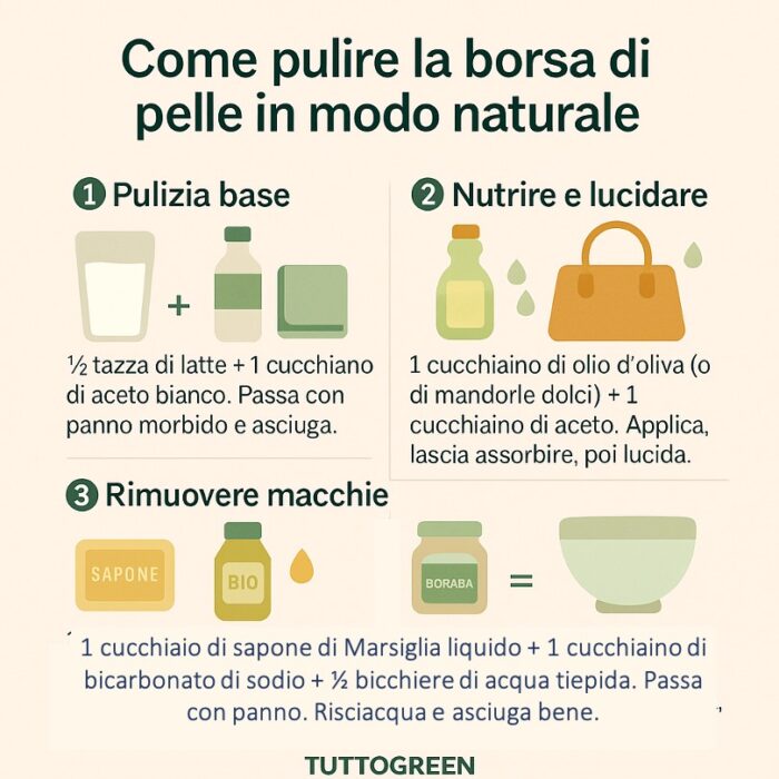 Le borse in pelle sono eleganti, resistenti e senza tempo — ma solo se curate nel modo giusto. Polvere, pioggia, macchie e usura quotidiana tendono a opacizzare e seccare la pelle, facendole perdere morbidezza e colore. La buona notizia? Puoi farla tornare brillante e morbida senza ricorrere a spray chimici o detergenti aggressivi. Bastano pochi ingredienti naturali e un panno morbido per ridarle vita, profumo e lucentezza. Ecco come pulire e nutrire la pelle con 3 ricette semplici e sicure, adatte a ogni tipo di finiture.