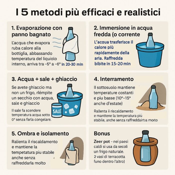 Perché funziona: l’acqua che evapora “ruba” calore alla bottiglia, abbassando la temperatura del liquido interno