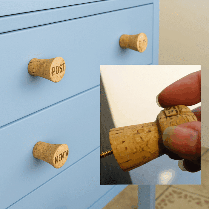 Altra bella idea e dare un tocco vintage ad una vecchia scarpiera o una cassettiera mezza rotta. I tappi da champagne sono perfetti per sostituire le maniglie rotte dei mobili. Basta fissare il tappo al centro del cassetto o sull’anta dell’armadietto.