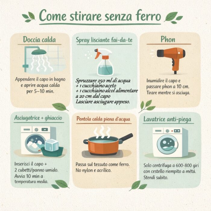 | Spray anti-pieghe fai-da-te | Acqua + aceto rilassano le fibre | Molto efficace, economico | Serve prepararlo |