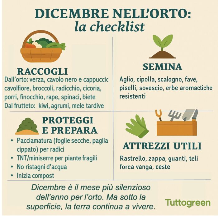 Dicembre è il mese più silenzioso dell’anno per l’orto. Ma sotto la superficie, la terra continua a vivere. Le gelate si fanno più frequenti, le giornate sono corte e la tentazione di abbandonare tutto è forte… eppure, è proprio ora che si gettano le basi per una primavera rigogliosa. Con qualche accorgimento, e un pizzico di pazienza, anche l’orto di dicembre può diventare un luogo pieno di attività e soddisfazioni.