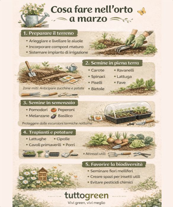 Marzo è il vero inizio dell’orto. Le giornate si allungano, il sole scalda il terreno e la natura accelera il suo ritmo. È il mese in cui si passa dalla pianificazione all’azione concreta: chi semina bene ora raccoglierà soddisfazioni per tutta la stagione. Ecco tutto quello che conviene fare nell’orto a marzo, con consigli pratici e semplici da applicare.