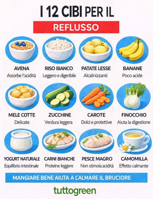 Quel fastidioso bruciore che sale dallo stomaco fino alla gola… Se soffri di reflusso, sai bene di cosa parliamo. Il reflusso gastroesofageo è sempre più diffuso e spesso peggiora con stress, pasti abbondanti e scelte alimentari sbagliate. Ma la buona notizia è che il cibo può diventare parte della soluzione. Vediamo cos’è il reflusso, perché compare e quali sono i 12 alimenti più adatti per ridurre l’acidità in modo naturale.