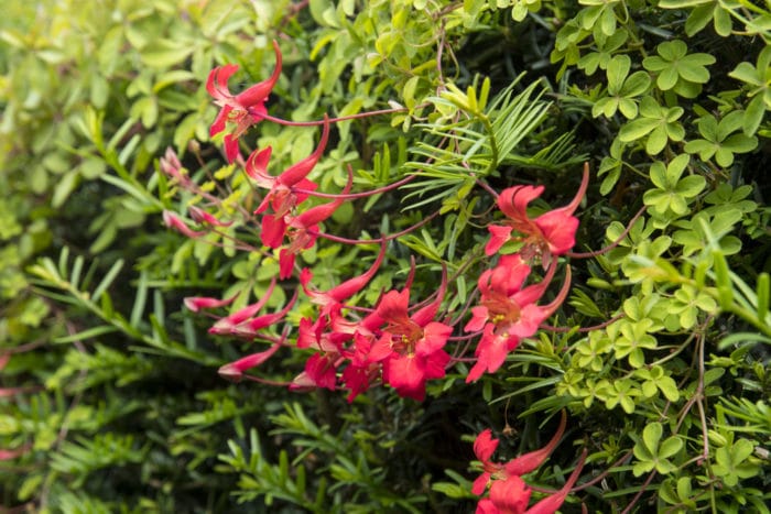 - Tropaeolum speciosum. Conosciuto anche come tropeolo e cappuccina, è un rampicante della famiglia delle Tropaeolaceae, originario del Sudamerica. Si sviluppa in altezza da un tubero, senza mai però raggiunge dimensioni eccessive (massimo 3 m). Presenta foglie verde brillante, lisce e tondeggianti, mentre in estate produce piccoli fiorellini rossi a forma di campanella allungata. Dopo la fioritura fanno la loro comparsa anche delle belle bacche blu. Si consiglia di piantarla (anche in vaso) in luoghi a mezz’ombra, freschi ma con terreni ben drenati. Non richiede attenzioni e cure particolari.