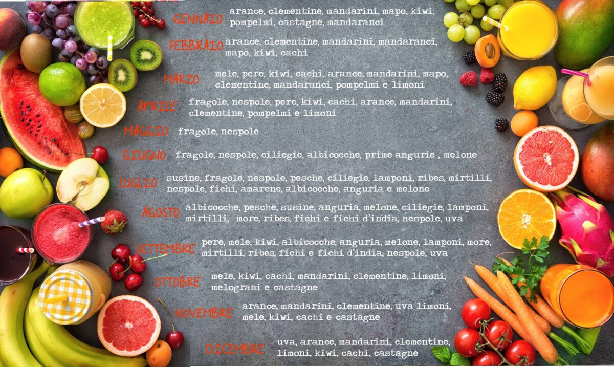 | FRUTTA | fragole, nespole, , pere, kiwi, cachi, arance, mandarini, clementine, mandaranci e mapo, pompelmi e limoni |