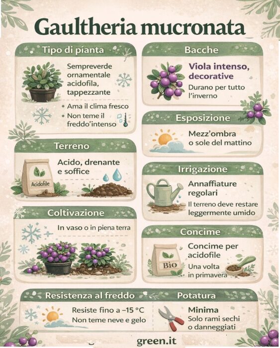 C’è una pianta che sembra fatta apposta per rendere bello l’inverno. Piccola, ordinata, sempreverde e capace di produrre bacche viola intense che resistono fino a primavera. È la Gaultheria mucronata, una di quelle piante che piacciono subito: non chiede troppo, si adatta bene e fa scena anche quando tutto il resto del giardino è spoglio. Perfetta per vasi, bordure e balconi “tristi” da ravvivare.