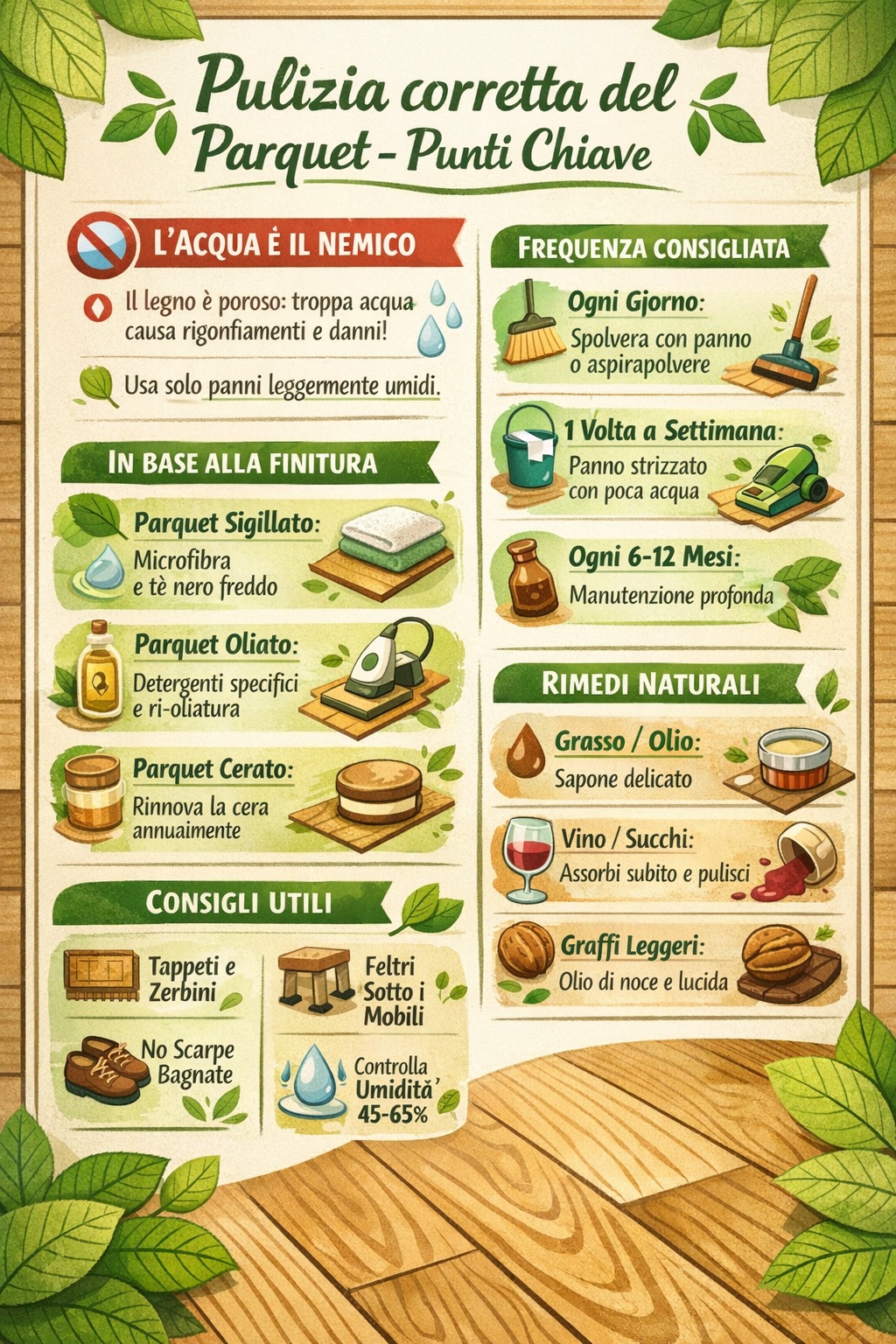 - Una volta a settimana: utilizza un panno leggermente inumidito con acqua o con un detergente specifico per parquet. Muoviti sempre nel senso delle doghe.