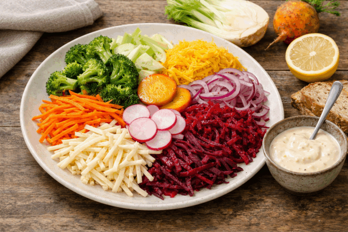 Insalata invernale di verdure croccanti con salsa yogurt e senape, un’esplosione di gusto sano