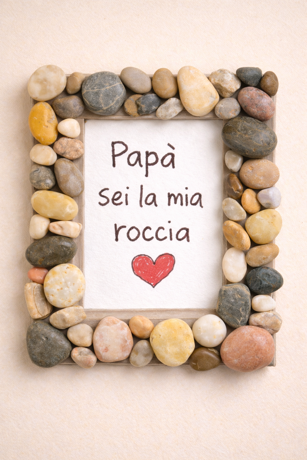 Raccogliete sul greto del fiume o sulla spiaggia dei piccoli ciottoli levigati dall’acqua per creare una cornice porta-foto al vostro papà.