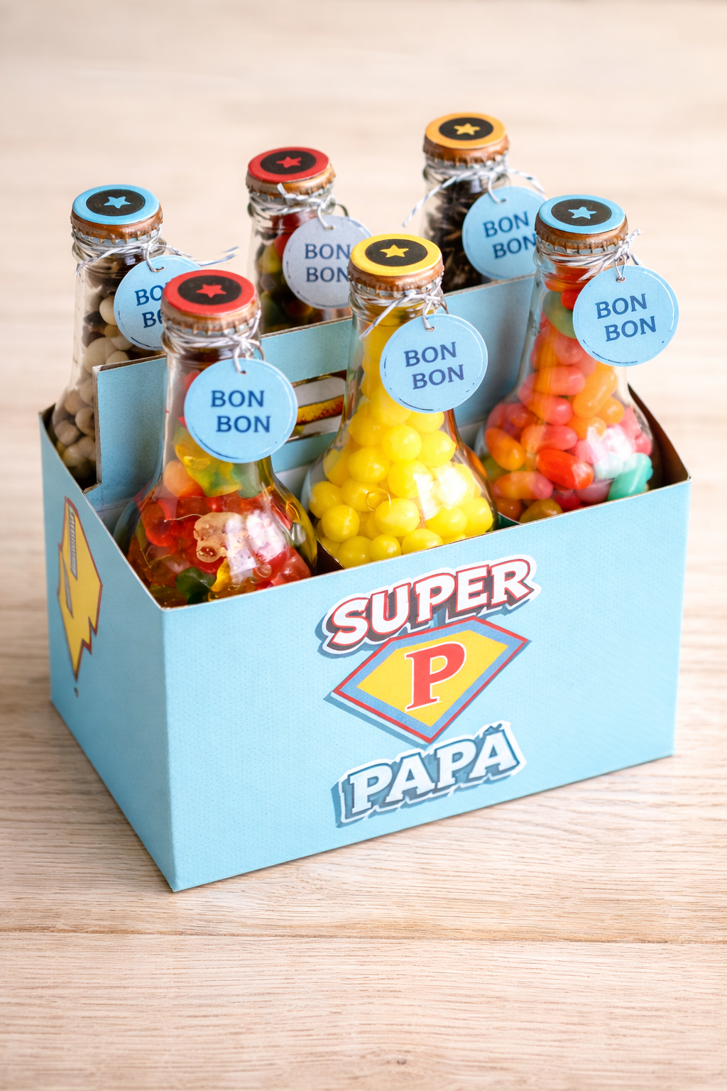 Iniziamo con un lavoretto abbastanza complesso che prevede il riciclo creativo di bottiglie di vetro: si tratta del kit di pronto-soccorso con caramelle per papà in difficoltà.