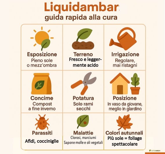 C’è un momento dell’anno in cui il Liquidambar sembra incendiarsi: le sue foglie si accendono di rosso, arancio e porpora. Ma dietro questo spettacolo non c’è magia: ci sono le condizioni giuste. Terreno fresco, luce equilibrata, poche ma precise cure e un tocco di attenzione alla biodiversità. Che sia in giardino o sul terrazzo nei suoi primi anni di vita, questo albero nordamericano sa regalare colore, ombra e una sorprendente resistenza. In questa guida scoprirete come scegliere la posizione ideale, come irrigarlo senza errori, quali malattie possono colpirlo e come prevenirle in modo biologico. Pronti a vedere il tuo liquidambar brillare?
