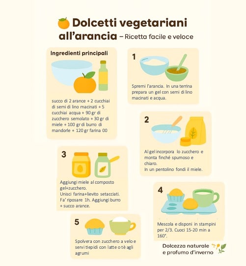 Ecco gli Ingredienti per 4 persone per preparare questi dolcetti, ricordandovi che potete sostituire all’arancia, le note più fresche del limone o leggermente acide ma dolcissime del mandarino satsuma, una varietà giapponese a buccia sottile e senza semi. Ricordiamo che al posto delle 2 uova, come legante vi consigliamo un gel a base di semi di lino macinati e acqua.