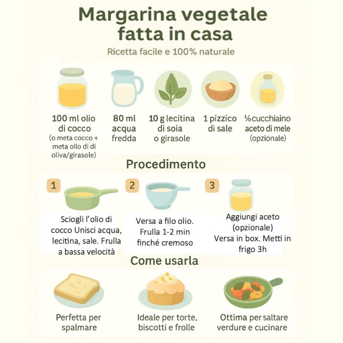 La margarina vegetale, se fatta in casa o scelta con cura, è un alleato versatile e più leggero del burro, adatto a chi cerca un’alimentazione più vegetale e consapevole. È ottima per spalmare, cucinare, pasticciare dolci e piatti salati senza rinunciare a gusto e consistenza.