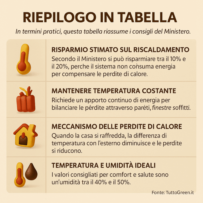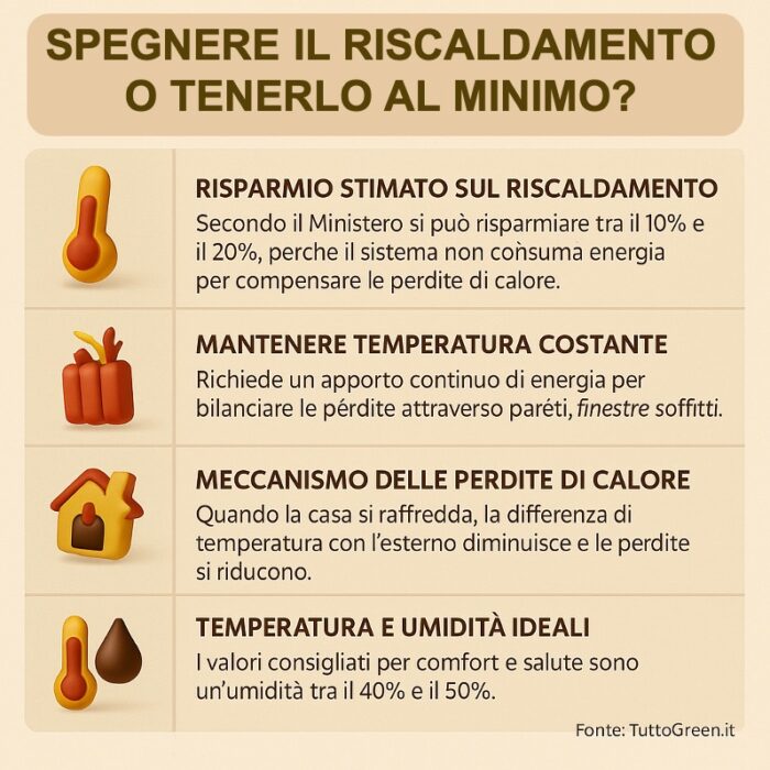 Il testo del Ministero per la Transizione Ecologica e la Sfida Demografica chiarisce il punto con frasi semplici ma decisive: mantenere una temperatura stabilmente richiede un apporto continuo di energia e spegnere il riscaldamento quando si esce comporta un risparmio stimato tra il 10% e il 20%.