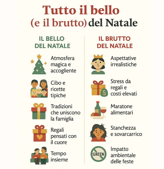 Il Natale ha un fascino tutto suo: basta una luce calda o un profumo di cannella e, improvvisamente, torniamo un po’ bambini. Ma il web ci ricorda che, insieme alla magia, arrivano anche certi lati meno scintillanti che ogni anno ci accompagnano con sorprendente puntualità. E sì, proprio questo mix di emozioni è il motivo per cui il Natale continua a piacerci… nonostante tutto. Di seguito una selezione delle cose più belle e più brutte delle feste, frutto di ricerche online, forum, trend social e articoli virali degli ultimi anni.