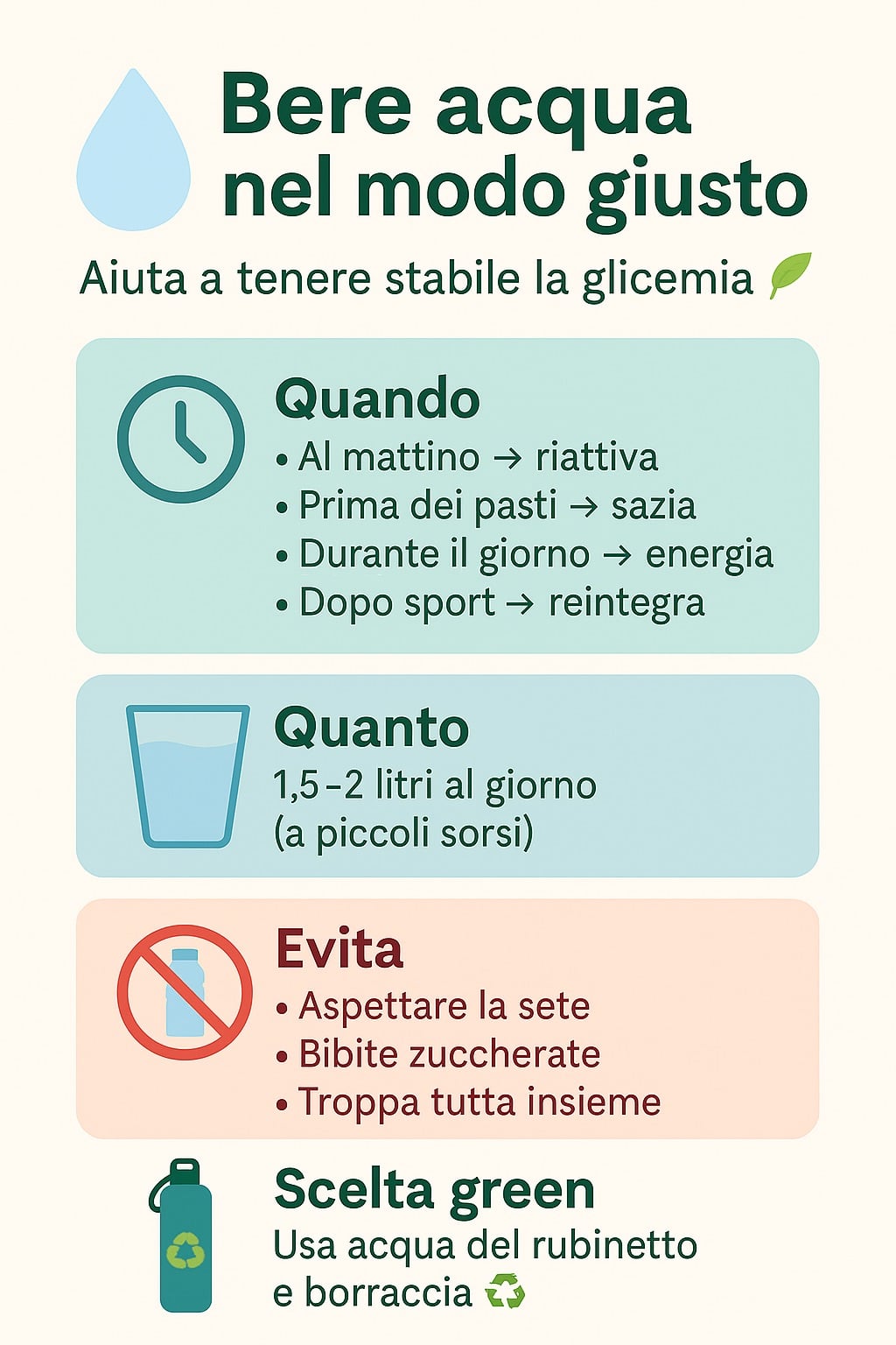 Bere acqua nel modo giusto è un’abitudine semplice, naturale e sostenibile che favorisce la salute, la concentrazione e la stabilità della glicemia. Un gesto piccolo ma potente, che ogni giorno può fare la differenza — per te e per il pianeta 🌍💧.