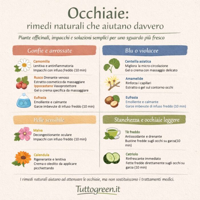 | Rimedio naturale O erboristico | Tipo di occhiaia | Come utilizzarlo | Beneficio principale |