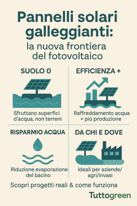 Conviene soprattutto ad aziende agricole con invasi d’irrigazione, gestori di dighe idroelettriche, industrie con bacini di raffreddamento e comunità energetiche locali che dispongono di superfici d’acqua inutilizzate.