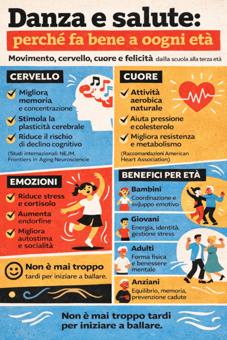 La danza non è solo arte. Non è solo sport. È una delle attività più complete che esistano per il corpo e per la mente. E la buona notizia è questa: non è mai troppo tardi per iniziare. Dalle scuole dell’infanzia ai corsi per over 70, la scienza negli ultimi vent’anni ha accumulato prove solide sui benefici della danza in tutte le fasi della vita. Non si tratta solo di “fare movimento”, ma di un’attività che combina coordinazione, memoria, emozioni, musica e relazione sociale. Un cocktail potentissimo per la salute. Vediamo perché.