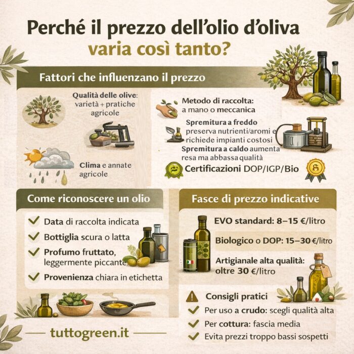 Hai presente quella bottiglia d’olio in cucina, quella che usi tutti i giorni? Probabilmente l’hai pagata pochi euro… oppure ti sei chiesto perché un’altra costa il doppio (o più). L’olio d’oliva è uno degli alimenti più amati ma anche più misteriosi per prezzo e qualità: può costare 3 euro al litro o oltre 20 euro, ma qual è la differenza? In questa guida ti spiego tutti i motivi per cui il prezzo cambia, come capire quando un olio vale davvero il prezzo richiesto e come usarlo al meglio nei tuoi piatti.