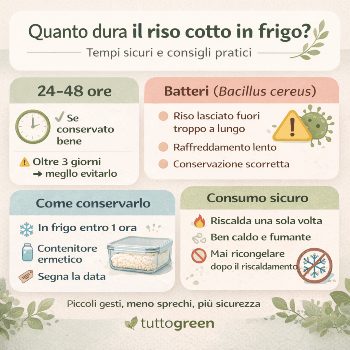 | Riso cotto in frigo | 24–48 ore | Conservare in contenitore ermetico |