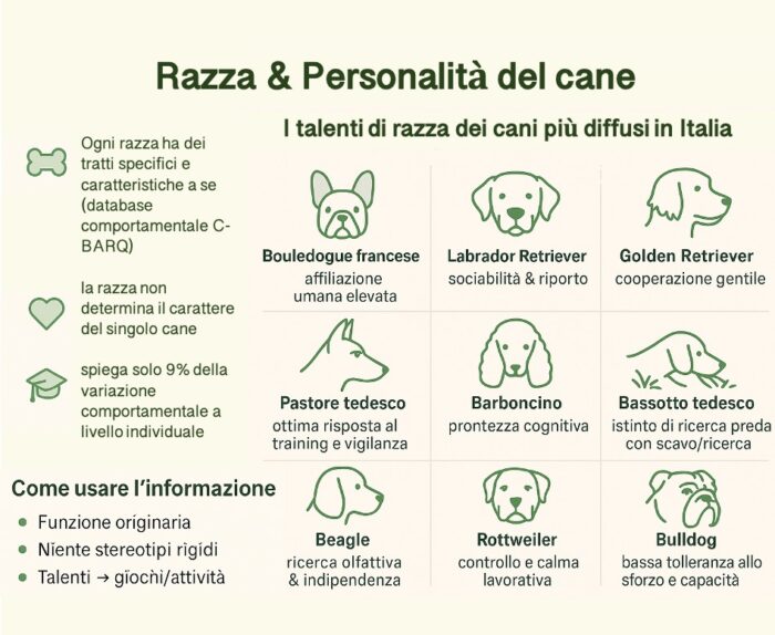 ‘È buono perché è un Labrador’, ‘abbia perché è un Chihuahua’: frasi come queste hanno un fondo di verità… ma solo in media. Le razze nascono per svolgere compiti diversi, quindi tendenze comportamentali possono ricorrere; tuttavia, ambiente, educazione e individualità contano moltissimo. In questa guida sintetizziamo cosa è più probabile che sia di razza e cosa dipende dal singolo cane, con esempi chiari sulle 10 razze oggi più diffuse in Italia.