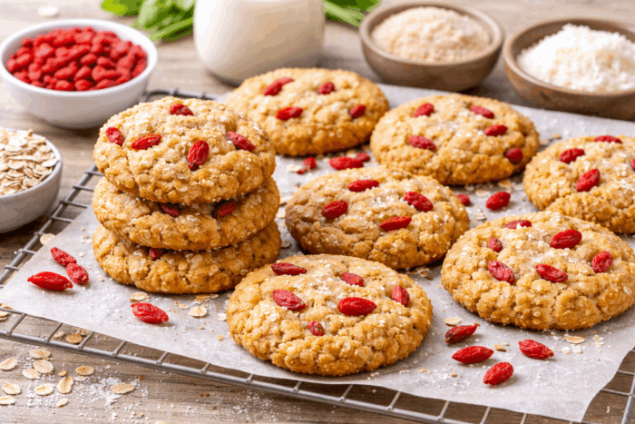 Ecco la ricetta per dei gustosi biscotti con bacche di Goji senza latte, uova e burro, ma arricchiti con il gusto del cocco e dell’avena, per godere delle loro proprietà antiossidanti di questi frutti orientali in maniera sana.