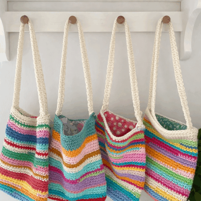 Un progetto perfetto per usare gomitoli piccoli: scegli colori contrastanti per un effetto “arcobaleno” e lavora punti bassi o a maglia bassa.