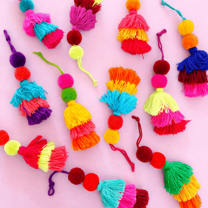 Aggiungete un tocco boho ai tuoi cuscini o tappeti fatti a mano aggiungendo nappe o frange multicolori, realizzati con gli scarti.