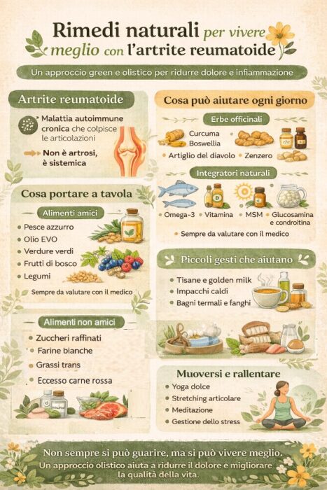 L’artrite reumatoide non è solo un dolore alle articolazioni: è una condizione autoimmune cronica che cambia il rapporto con il proprio corpo, l’energia quotidiana e la qualità della vita. Accanto alle cure della medicina convenzionale, sempre fondamentali, molte persone cercano rimedi naturali, approcci dolci e strategie quotidiane per ridurre l’infiammazione, alleviare il dolore e ritrovare equilibrio.