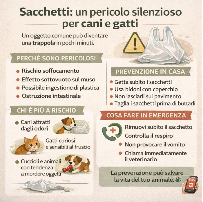 Un sacchetto vuoto sul pavimento. Un attimo di distrazione. E quello che sembra un oggetto innocuo può trasformarsi in un pericolo silenzioso per il nostro cane o gatto. Ogni anno, molti incidenti domestici che coinvolgono animali da compagnia hanno una causa sorprendentemente semplice: i sacchetti di plastica, quelli delle patatine, della spesa o dei rifiuti. Attirano per l’odore, fanno rumore, si muovono leggeri nell’aria… e in pochi secondi possono diventare una trappola.