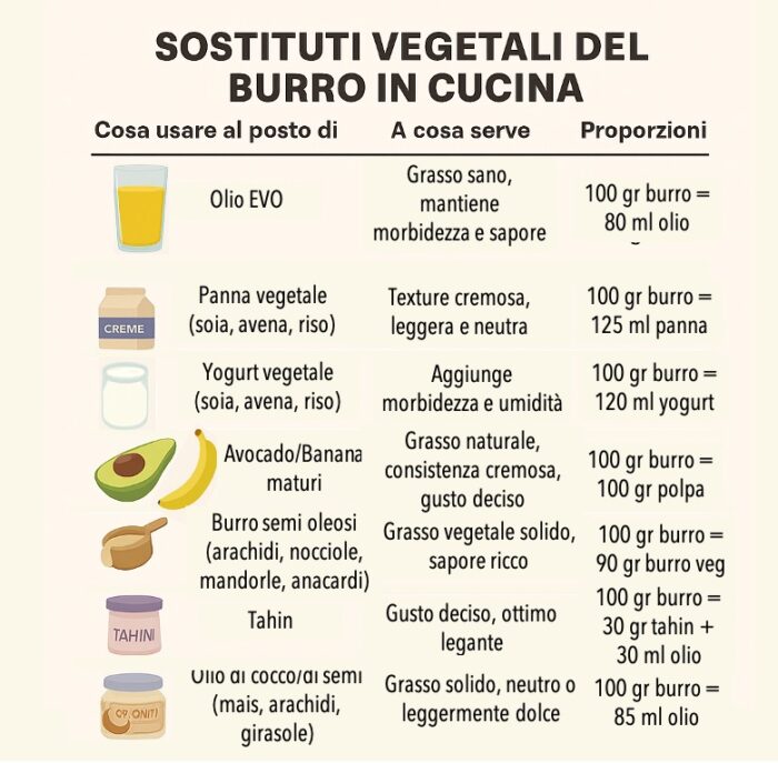Riassunto dei sostituti vegetali di ingredienti grassi animali nelle ricette.