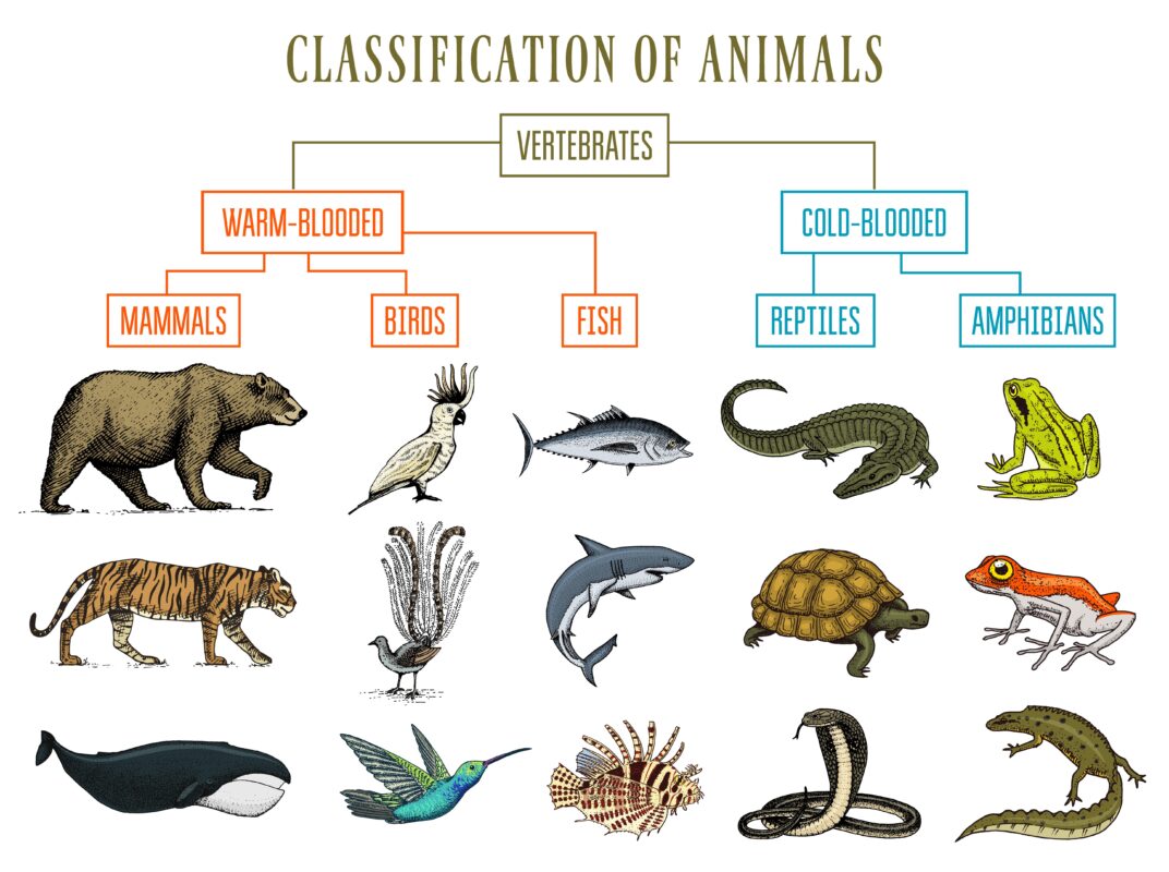 - Vertebrati: caratterizzati da una colonna vertebrale, cordone nervoso e cranio contenente il cervello. Comprendono pesci, anfibi, rettili, uccelli e mammiferi.