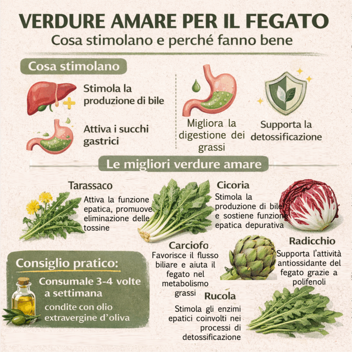 Il fegato è il nostro grande laboratorio interno. Non ha bisogno di soluzioni estreme, ma di equilibrio quotidiano. Le verdure amare sono uno strumento semplice, naturale e scientificamente sensato per sostenerlo.